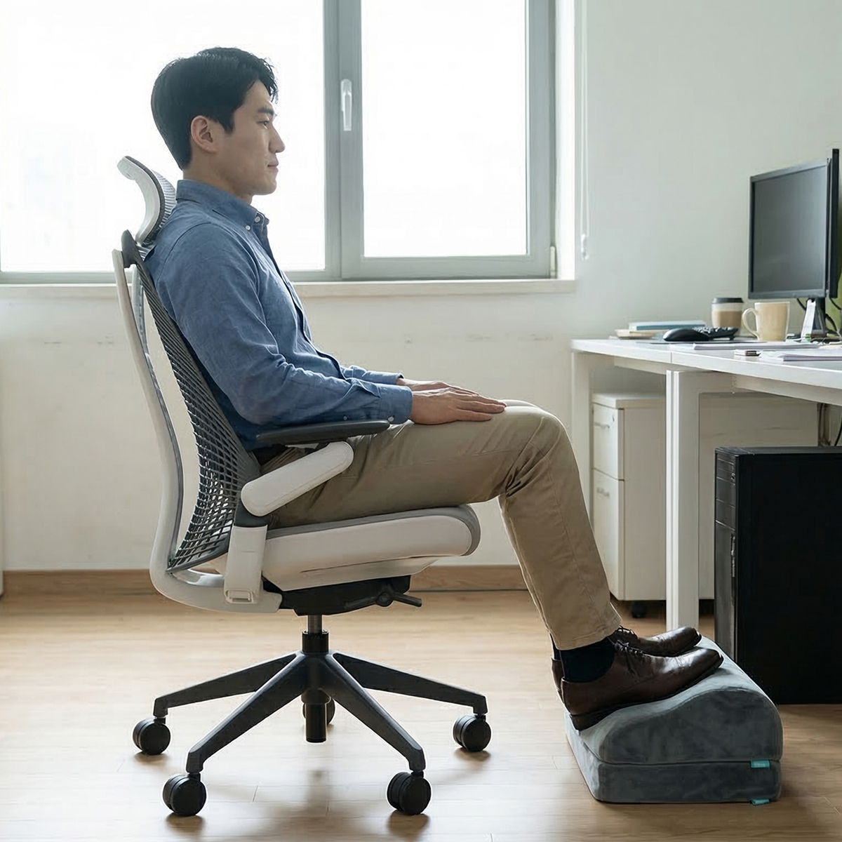 วางเท้าให้ราบกับพื้น มุมข้อเข่าตั้งฉาก ถ้านั่งแล้วเท้าลอย น้ำหนักตัวจะเทไปกดที่ก้นและต้นขามากขึ้น ควรปรับเก้าอี้ให้เท้าเหยียบพื้นได้เต็มฝ่าเท้า และข้อเข่าทำมุม 90-100 องศา หากโต๊ะทำงานสูงเกินไปจนต้องปรับเก้าอี้ให้เท้าลอย แนะนำให้ใช้ที่วางเท้าเพื่อสุขภาพ วางรองใต้ฝ่าเท้า เพื่อปรับมุมข้อพับเข่าและสะโพกให้ถูกต้อง ช่วยลดแรงกดทับที่ก้นกบและลดอาการขาชาได้ดีมาก